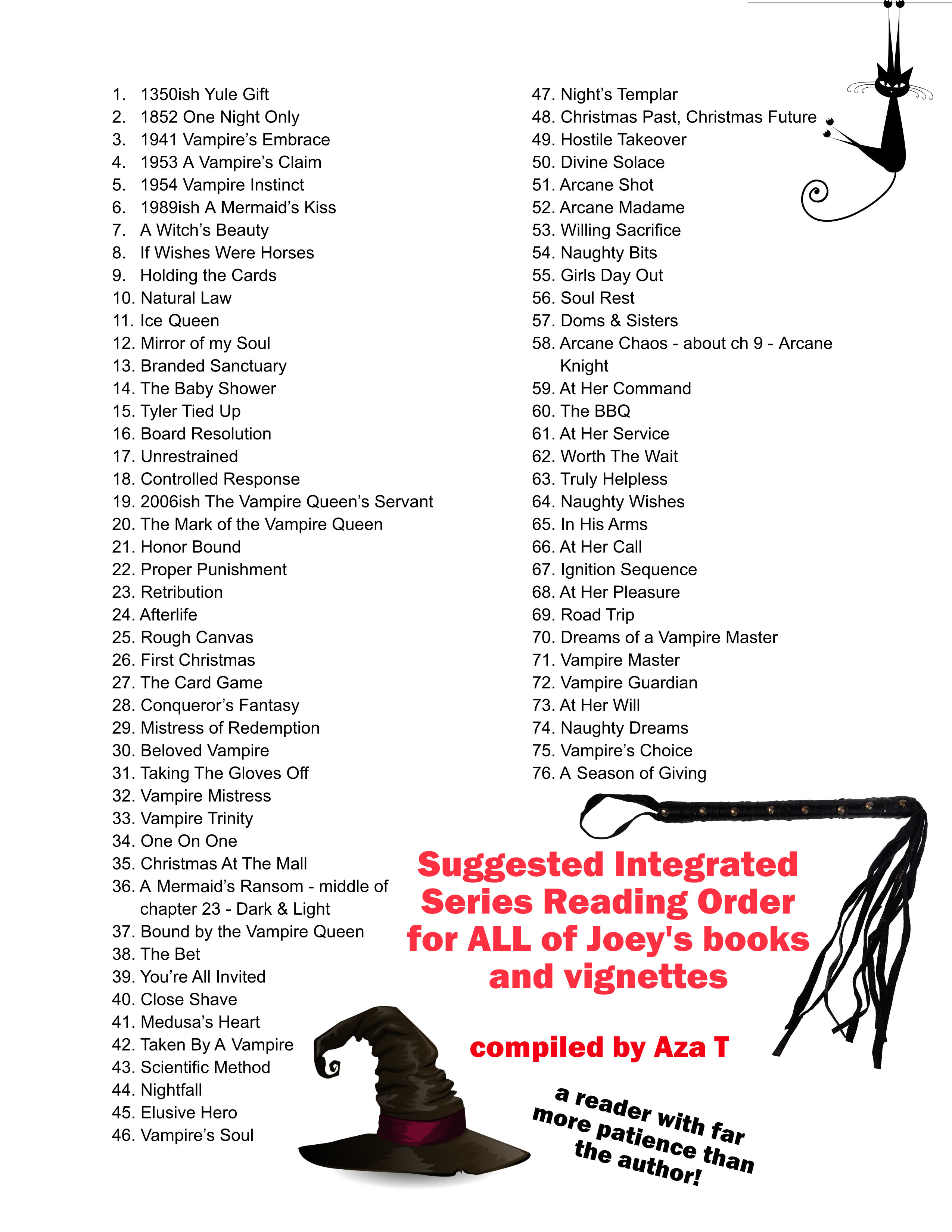 Well, one of my readers, Aza T, gave it the latest shot, and sent me this amusing note with it: "So Joey - I finished the Daughters of Arianne series, and as I was reading David and Mina's book I was totally questioning if David was Marguerite's brother, and then when I read 'Dark and Night' you confirmed it. This started me thinking about what is the proper reading order of ALL your books to avoid spoilers, since the Muse insists on having your characters pop in and out of your series. I have attached what I think is the best order based on recent reading, skimming books, and memory. I'm good with you sharing this however you would like to get input from other obsessive readers like myself. Note: You will notice I put Dark and Night with A Mermaid's Ransom since it basically happens in the middle of Chapter 23, and Arcane Knight after about Chapter 9 in Arcane Chaos."